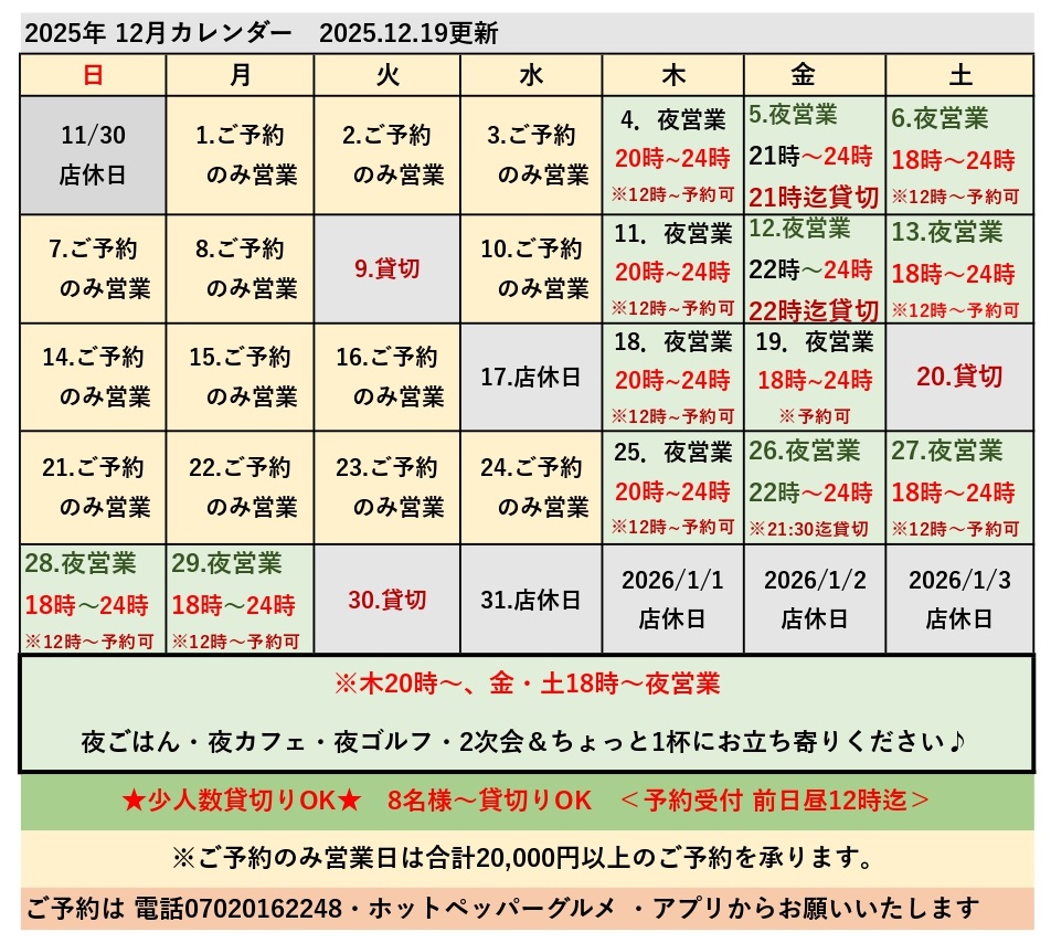 ご予約のみ営業は12時~24時まで、スペース利用、お食事、ご宴会ご予約承ります。