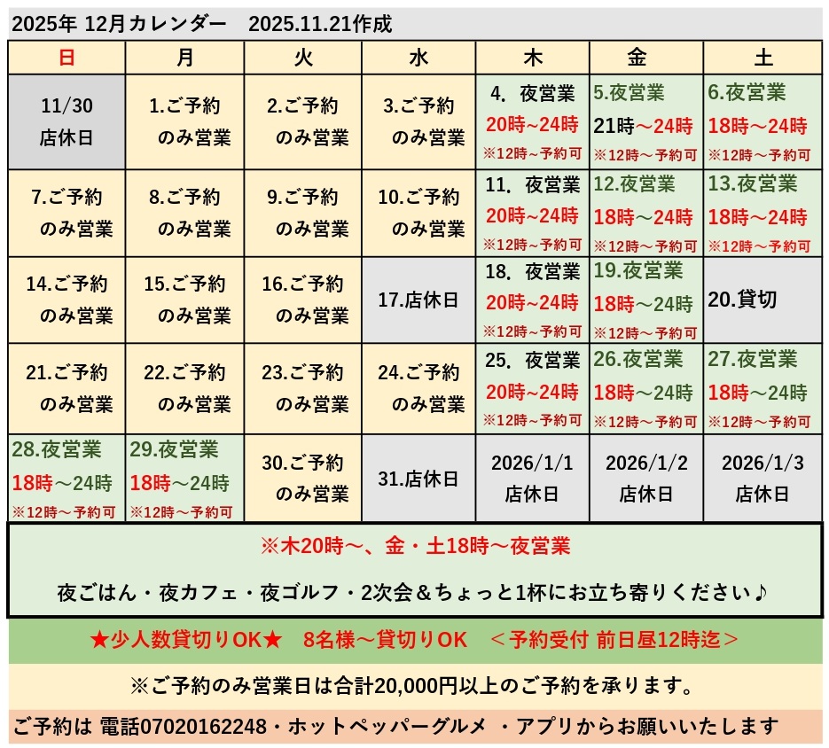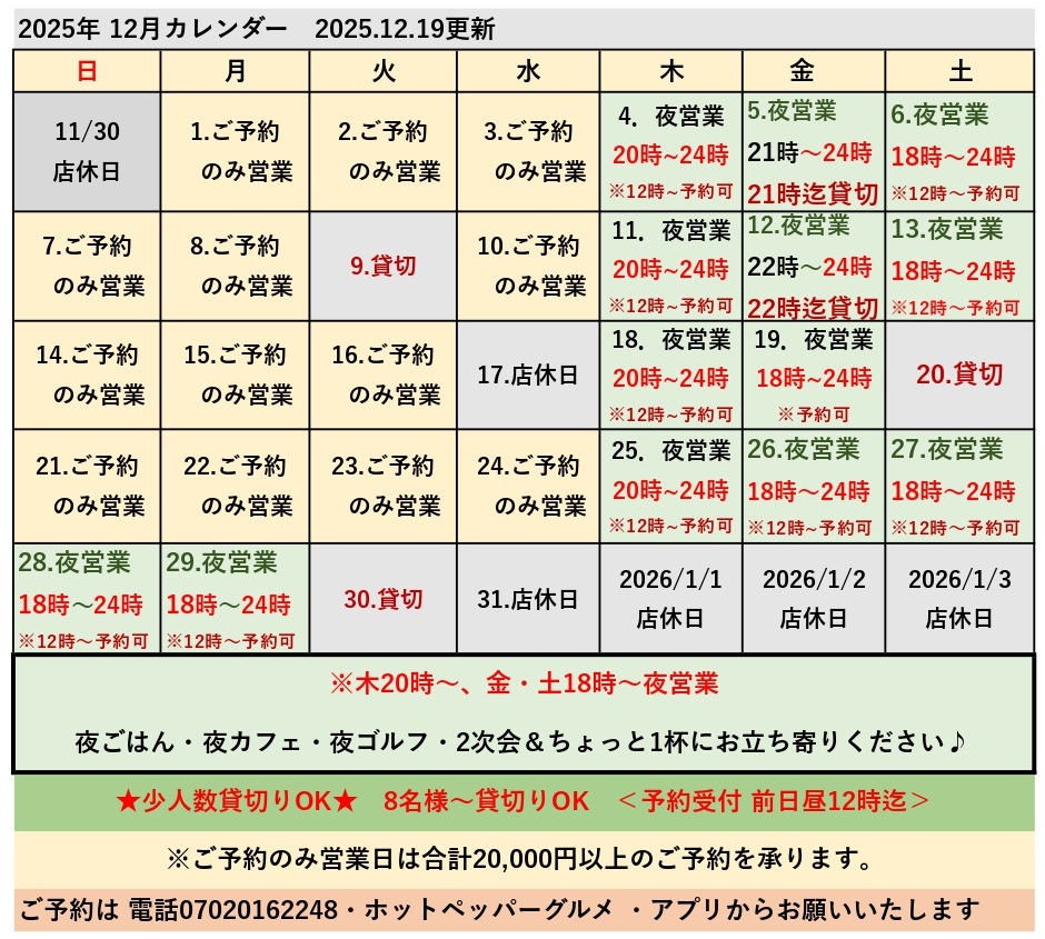 ご予約コース8名様~3時間貸切りOK、12月まだまだご用意出来る日があります。